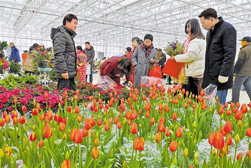 春节期间,安徽滁州南谯区花鸟鱼虫市场,市民在选购鲜花绿植。董 超摄?。ㄖ芯泳酰?/p>