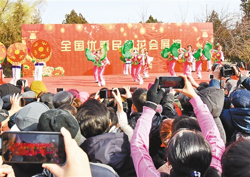 2月9日,游人在观看北京地坛春节文化庙会举办的全国优秀民间花会展演。 新华社记者 李 欣摄