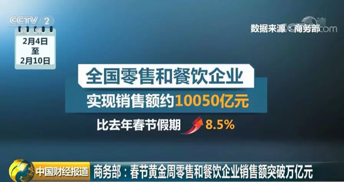 据商务部监测,除夕至正月初六,全国零售和餐饮企业实现销售额约10050亿元,比去年春节假期增长8.5%。