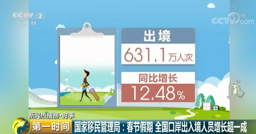 春节期间,入境622.2万人次,同比增长9.51%;出境631.1万人次,同比增长12.48%。