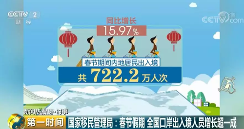春节期间内地居民因私出入境增长最为明显,共722.2万人次,同比增长15.97%。