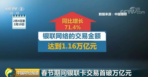 中国银联的统计显示,从除夕到正月初六7天假期,银联网络的交易金额已达到1.16万亿元,相比去年同期增长了71.4%。