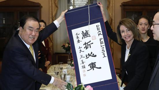 关键词:韩国议长访美 手书荀子名言"万折必东"赠予佩洛西