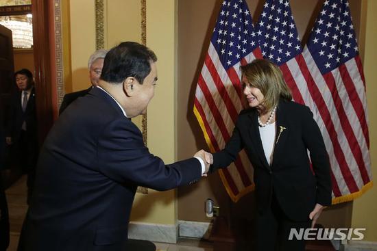 文喜相与佩洛西握手。(纽西斯通讯社)
