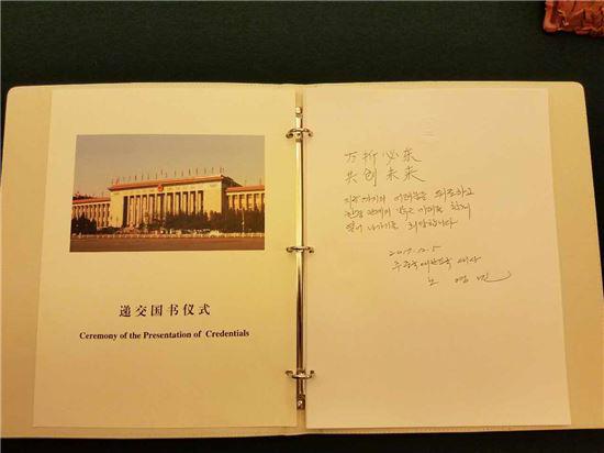 2017年韩国驻华大使递交国书,用汉语写“万折必东”。(韩国驻华大使馆)