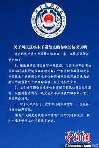 对于此事,呼和浩特市城市管理综合执法局新闻发言人刘四平在2月3日主动站出来“答疑解惑”称,“并非不让在主干道张贴春联,为了不影响节后清理,企事业单位及商铺可将春联贴在本单位或商铺自身的门窗内外等其它易清理位置……”。