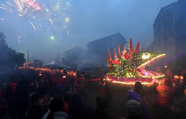 2月17日,村民舞起梅烛灯在锣鼓烟花中绕村游走。