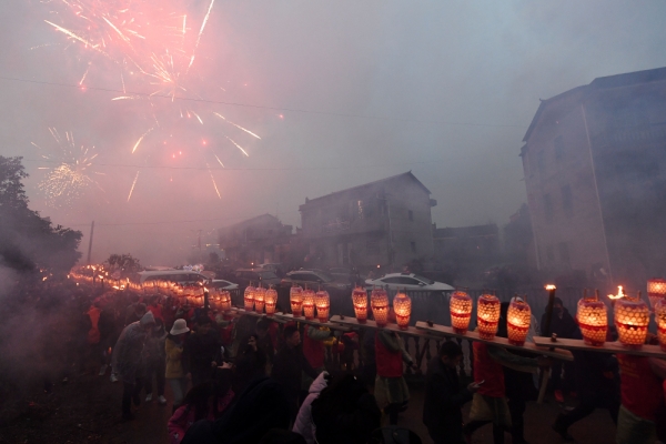 2月17日,村民舞起梅烛灯在锣鼓烟花中绕村游走。