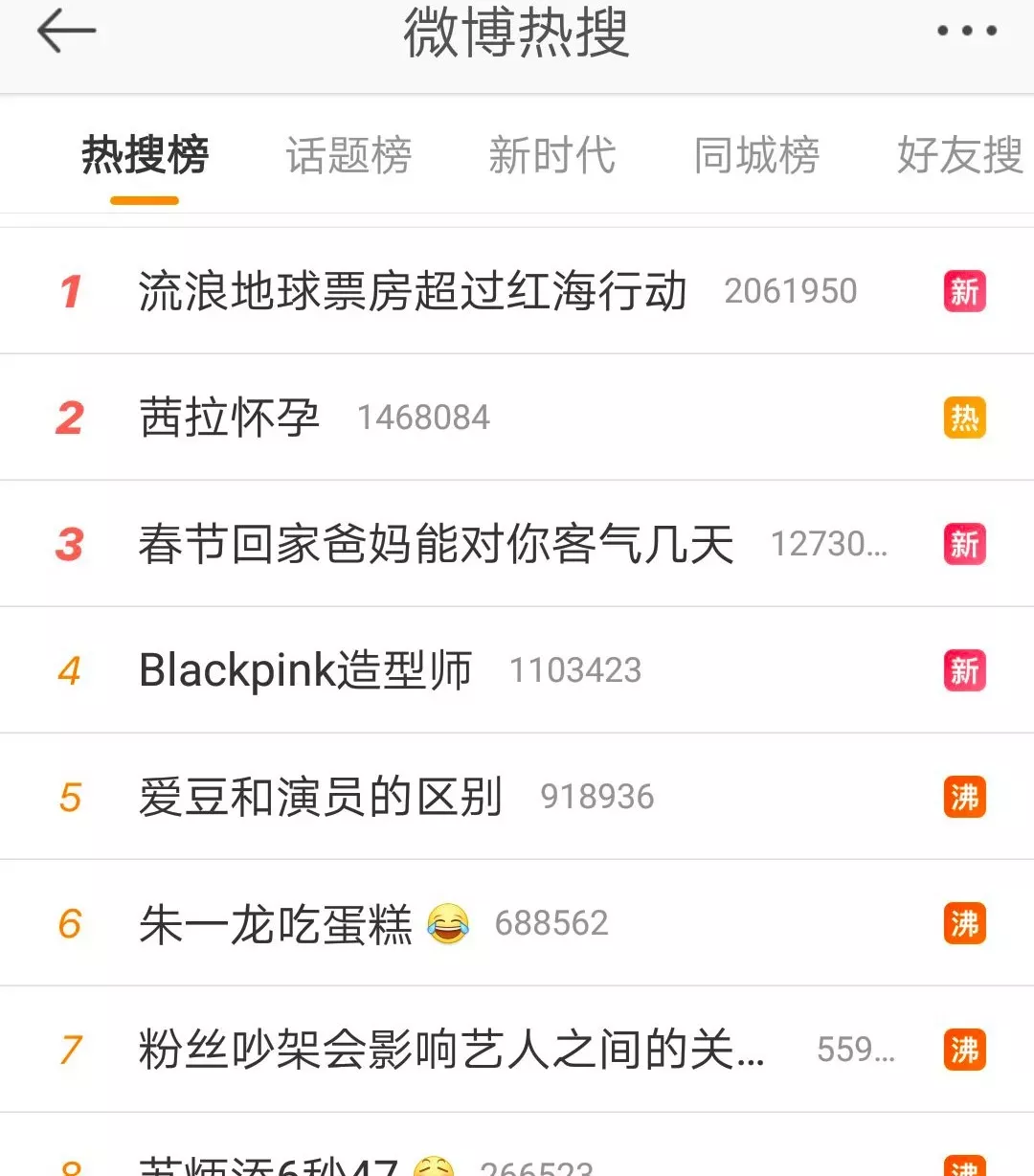 “流浪地球票房超过红海行动”话题冲上微博热搜第一!