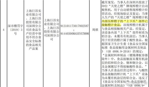 根据深圳市场监管局网站公示的处罚信息显示,有举报称 “天使之橙”现榨橙汁自动贩售机,有多个与食品接触的部件不符合国家食品安全标准。经过现场验证及鉴定,深圳市场监管局认为橙汁机内部压榨橙子的“上下爪”部件已接触橙汁食品,所以橙汁机属于与食品接触的相关产品。在上下爪没有做涂层防护的情况下,会有金属物质析出并进入食品的风险。