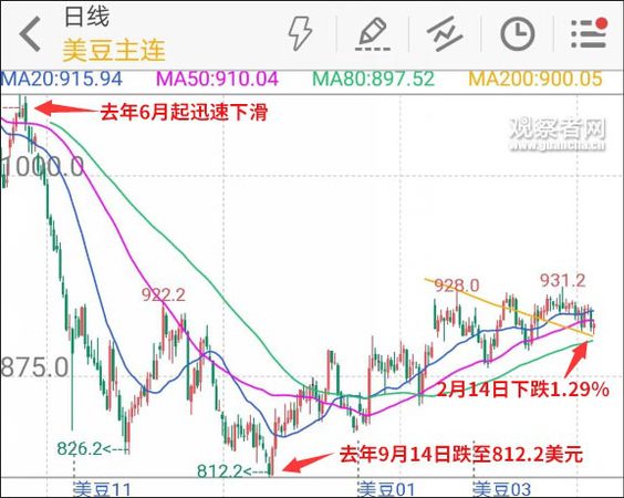芝加哥期货交易所(CBOT)大豆期货价格走势:去年5月底开始,由1045美元/蒲式耳的高点一路下滑,在9月一度跌至低点812.2美元/蒲式耳,目前随着“中美贸易战停战”逐渐回升至900美元/蒲式耳的水平。