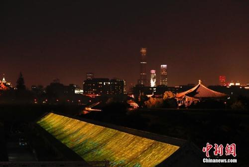 此外,午门至神武门东侧城墙区域,由充满节日氛围的红灯笼点缀城墙,引导观众步行。临近城墙西侧的建筑也被点亮,营造出喜庆祥和的节庆氛围?!肚Ю锝酵季怼返然婊髌芬砸帐醯乒庑问?,投影于建筑屋顶上。