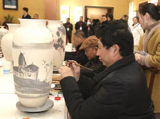民革党员艺术家在“金猪送福 喜迎新春”民革党员艺术家陶瓷作品展现场进行创作。
