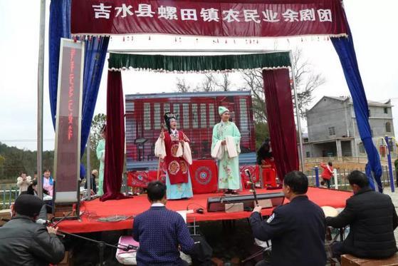 塔坪上村广场上,螺田镇农民业余剧团正在搭台唱戏。