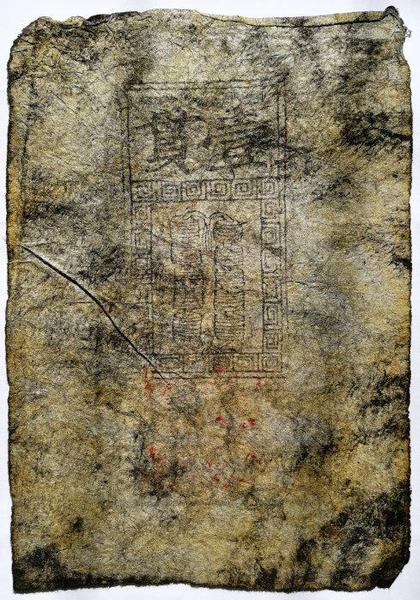 三、 实物保管不易。2014年时,此钞颜色鲜亮、字迹清晰、印色红润。可仅四年,此钞已氧化成一张黄灰色近似无字之纸,三方红色官印仅剩饻稀可辨的痕迹。黑色钞文已暗淡到非努力辨认不可识的地步。