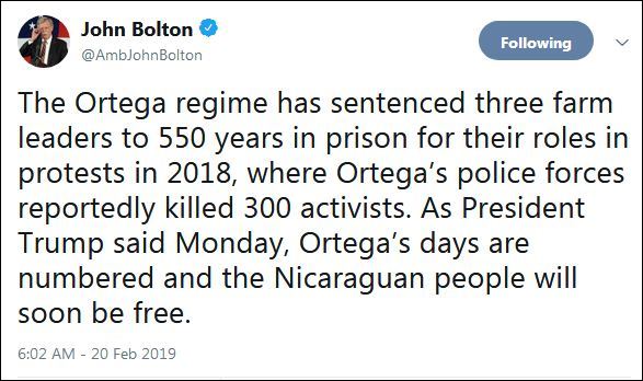 当地时间2月20日早上,美国总统国家安全事务助理博尔顿发推特指责尼加拉瓜总统奥尔特加,还传达特朗普的话说“日子不多了”。