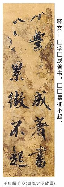 宋代王应麟《著书帖》行书。水墨纸本,纵30.3厘米,横18.4厘米。此帖流传有绪极为珍贵,现为著名书画家、篆刻家黄桢祥旧藏。此帖书法文风蔚然,熠熠生辉,运笔刚劲雄厚古朴端庄,富有典型的文人书卷气息,它是历史上不可多得的名贤瑰宝。是王应麟晚年归隐之后所作,书曰:“□学□成著书,□□累征不起,□□高致?!笨钍鹞坝耄ㄔ蓿保钕赂怯蓄杂?。通篇古朴俊逸,神韵盎然,将文化精髓融汇其中。