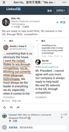 华为高层回应特朗普"不靠封杀"推文:已准备好竞争