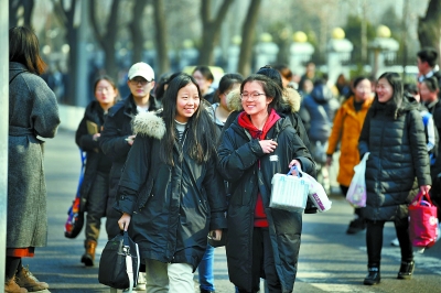 2月19日,中央美院2019年艺考启动,在北京服装学院考点,考生们结伴而行,表情轻松地进场考试。本报记者 和冠欣摄