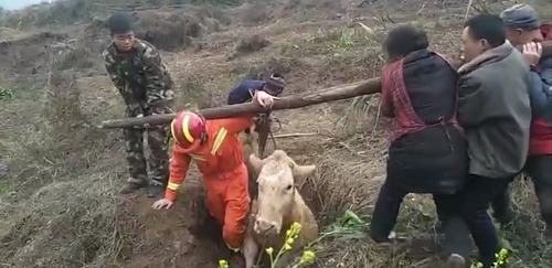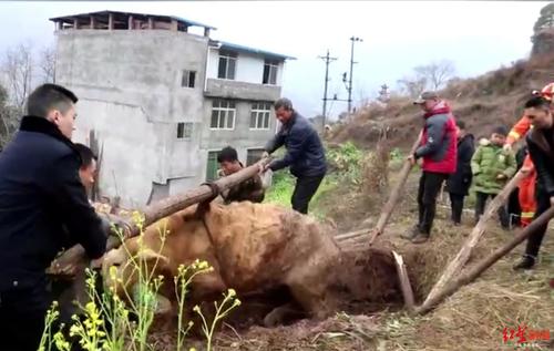 2月18日,四川省乐山市峨边县沙坪镇一头体型巨大的母牛不慎滑入一个深坑,被困长达7小时,母牛体力不支,在现场淡定吃草等待救援。最终,在@乐山消防的帮助下,母牛成功获救。