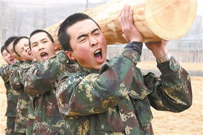 该基地官兵正在组织扛圆木训练。唐清盛摄