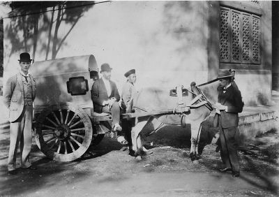 英国公使馆的马车。站在画面左侧的是英国女王派驻中国的全权领事甘伯乐,坐在马车上的是公使馆一等秘书宝克乐。