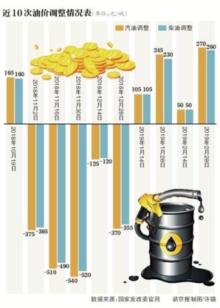 2019年第四轮成品油调价窗口再次开启。据发改委官网公布的消息,自2019年2月28日24时起,国内汽油、柴油价格(标准品,下同)分别上调270元/吨、260元/吨,创今年来最大上涨幅度。具体来看,本次油价上调折合每升89号汽油涨价0.20元、92号汽油涨价0.21元、95号汽油涨价0.22元,0号柴油则涨价0.22元。至此,今年以来我国成品油价格已经呈现出强劲的“四连涨”趋势。