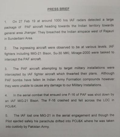 印军声明称,在随后的空战中,一架巴军F-16被印军一架米格-21Bison击落,前者的残骸坠毁到巴控区一侧。印军一架米格-21被击落,飞行员被俘。