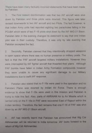 声明还驳斥了巴方此前声称“击落两架”战机的说法,仅承认一架米格-21被击落,一名飞行员被巴军俘虏。对于巴总理伊姆兰·汗宣布周五放人的承诺,声明表示欢迎。