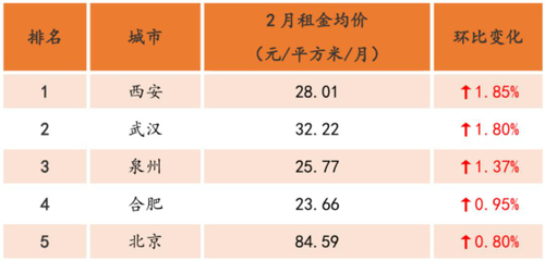 从环比涨幅TOP5城市来看,西安领涨。涨幅前五城中,西安、武汉、泉州月租金均价涨幅超1%。报告对此分析,经历了传统租赁淡季的北方、中部二线城市租赁市场逐步恢复,租金涨幅略有扩大。