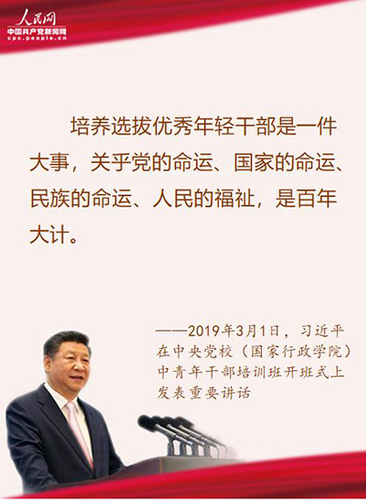 【编者按】2019年春季学期中央党校(国家行政学院)中青年干部培训班1日上午在中央党???。习近平总书记在开班式上发表重要讲话强调,培养选拔优秀年轻干部是一件大事,关乎党的命运、国家的命运、民族的命运、人民的福祉,是百年大计。