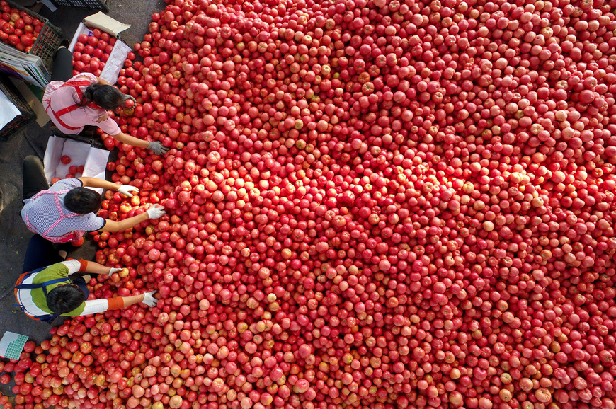农民在河北省滦县小马庄镇北京二商集团蔬菜基地内将采摘的西红柿装箱(2017年9月21日摄)。滦县加快新型农业经营体系建设,引导扶持农民种植绿色无公害蔬菜,使其规?;?、标准化、产业集群化发展。新华社记者牟宇摄