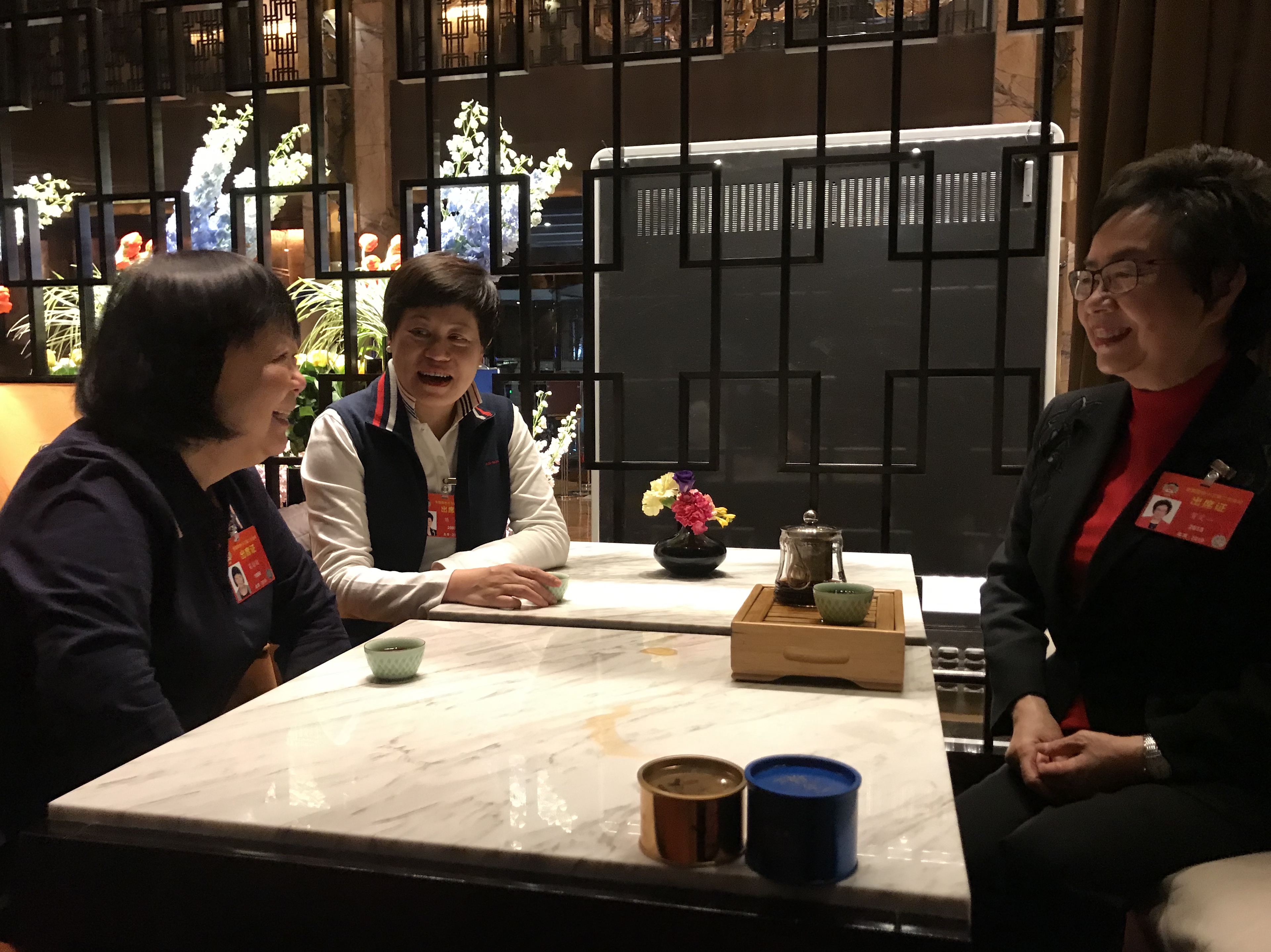3月5日晚,港澳委员驻地公共休息区一隅,结束了一整天的会议后,三位澳门女委员坐在一起品茶聊天。她们放下手机,聊及的却是有关手机的话题。