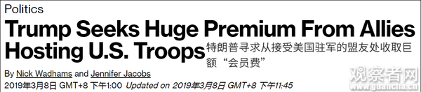 原标题:特朗普正研究要求盟国负担100%驻军费,再加50%“会员费”