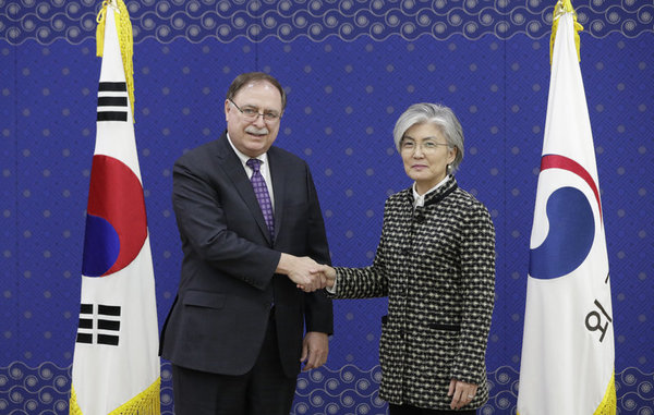 2月10日协议达成后,韩国外长康京和与美国国务院助理副国务卿蒂莫西·贝茨握手