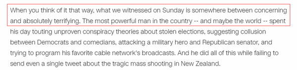 “我们在周日目睹的事情,介于忧虑与绝对令人恐惧之间。”这家媒体认为,这个国家最有权势的人耗费了大量时间在宣扬他未经证实的阴谋论上。并且,他发了这么多条推文,却没有一条关于新西兰悲惨枪击案的内容。