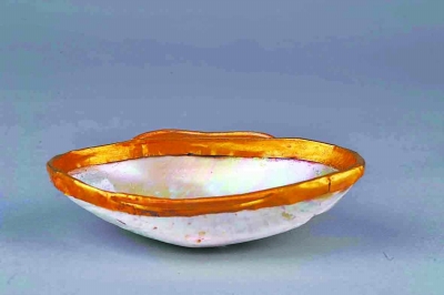 “持觞劝侯嬴”,李白《侠客行》中的羽觞即耳杯,盛行于战国至魏晋时期。因两侧有半月形耳,如鸟之羽翼,故而得名。西宁出土的这件十六国时期金扣蚌壳羽觞,杯身由一整块蚌壳加工而成,口沿镶有金片,双耳也由金片制成?;平鹩氚隹侵淞咏裘?,可谓天衣无缝?;平鹕匣箍逃邢肝⑽剖危饶苊阑妥笆尉票?,也能起到防滑的作用。青海并不产蚌,这件长13.7厘米,宽10厘米的大蚌,想必应系从内地流传而来。