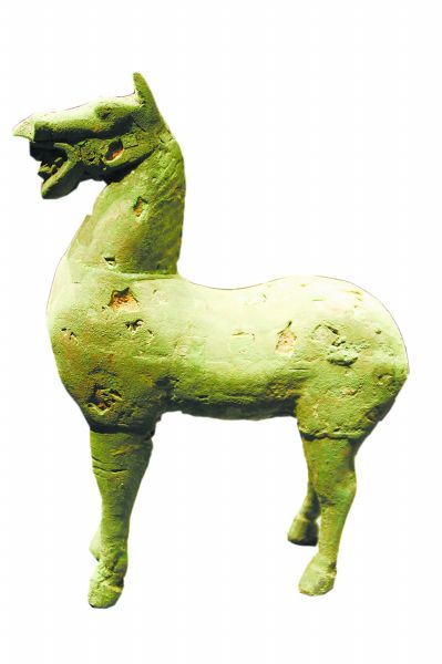 《相马经》记载,千里马“龙颅突目,平脊大腹,肶(大腿)重有肉”。西宁出土的东汉铜马就符合这一特征。它方额突目,鼻直口阔,耳小竖直,粗颈宽背,四肢强劲,比例匀称,强壮矫健?;艚莸男蜗?,使得人们不禁在它的面前停下脚步,驻足打Call。