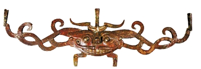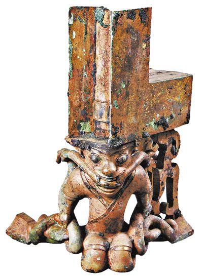 专家们说,这件屏风不仅规模大,而且结构奇巧。它中间的屏门可以向外开启,两侧的翼障以折叠构件连接,可以展开。而前面介绍的顶饰,就装饰在它的上部;下部是人操蛇造型的托座。