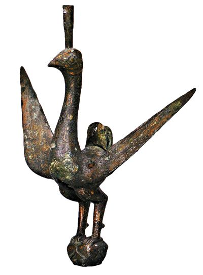 铜朱雀顶饰通高26.4厘米,双翅距宽24.5厘米。朱雀是汉代主管南方之神,是想象中的动物。朱雀昂首展翅,站在方座上,脖子、身体、双翅刻满了羽毛纹饰。方座四面装饰着火焰形纹饰,是一尊火中的神兽形象,栩栩如生。顶饰是屏风横梁上的装饰物,按南越王博物馆馆方的说法,出土时共有五件,都是青铜铸造,遍体鎏金。其中有两件朱雀顶饰,三件兽首顶饰。在朱雀头顶和兽头上都有一个圆管,可能是用来插羽毛的。