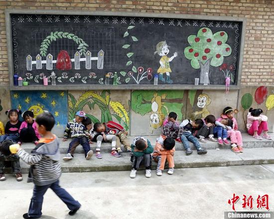 资料图:青海省一学校学生靠墙午睡。赵凛松 摄