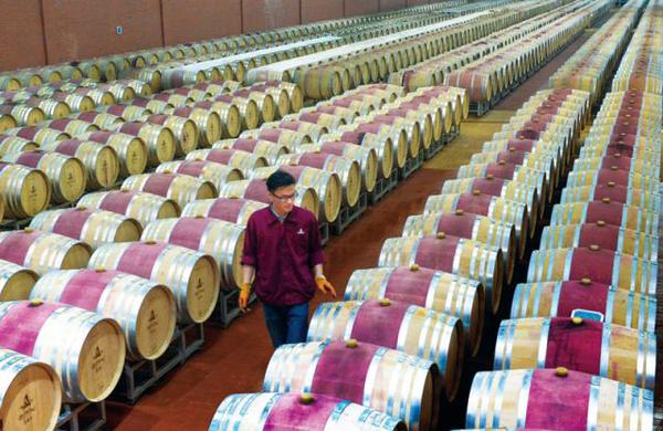 携手共圆全面小康梦,闽宁对口扶贫协作结硕果。闽宁镇以特色产业发展为支撑,培育了光伏、种植、葡萄酒等一批特色产业,为当地群众打开致富门提供了“金钥匙”。图为宁夏永宁县闽宁镇贺兰神酒庄的工人在检查橡木桶。詹安稳/摄