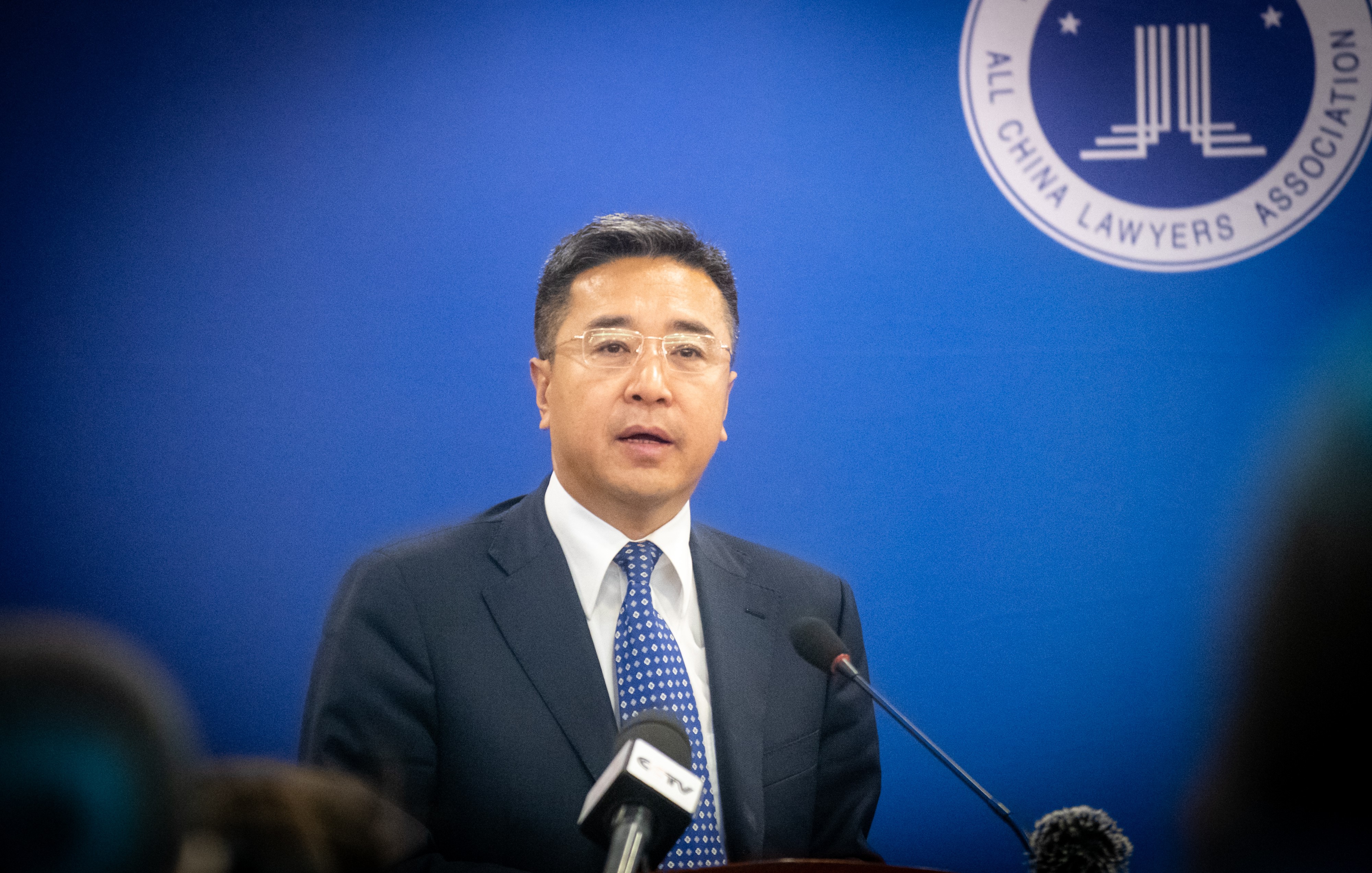 图为北京律师协会会长高子程介绍《北京市涉外法律服务调研报告》的相关情况