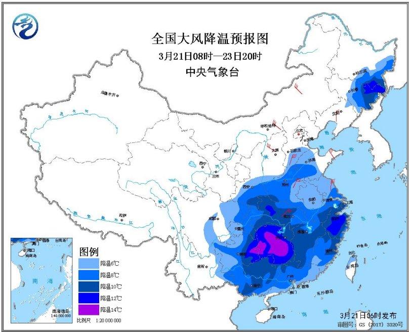 受较强冷空气影响, 3月21日至23日,东北地区东部、黄淮、江淮、西南地区东部、江汉、江南以及华南等地气温将自北向南先后下降6~10℃,其中湖南大部、贵州东部、浙江中部以及吉林东北部等地局地降温可达12℃以上,3月23日凌晨最低温度4℃线将位于江淮一带,各地降温后1-2日迅速回暖。东北地区南部、华北、黄淮、江淮等地将伴有4~6级偏北风,局地阵风可达7~8级。中央气象台3月21日06时继续发布寒潮蓝色预警。