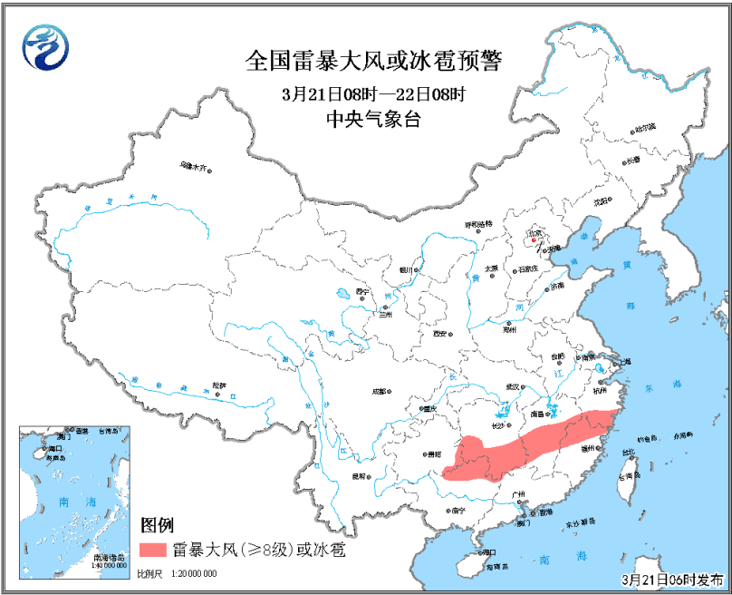 3月21日8时至22日8时,江西中部、浙江南部、福建北部、湖南南部、广西北部、贵州东部等地的局地将有8-10级雷暴大风或冰雹天气;此外,江西中部、浙江南部、湖南南部、福建北部、广西北部、重庆中南部、贵州东南部和东北部等地的部分地区将有短时强降水天气,小时雨量20-40毫米,局地可达50毫米以上。为此,中央气象台3月21日06时继续发布强对流天气黄色预警。