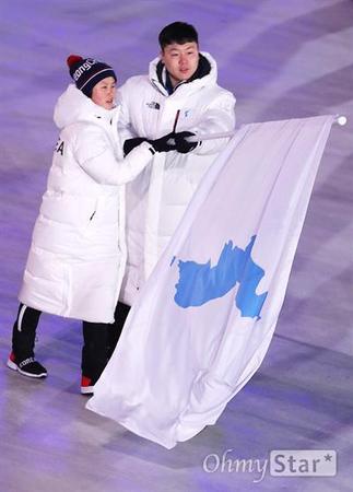 2018年2月平昌冬奥会,朝韩选手举统一旗入场。