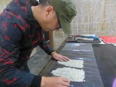 见到刘良勇时,他正和徒弟们拓碑帖。“这是一项传统技术,宋代就有了?!敝患系窨痰氖恰抖戮邮渴椤罚趿加骆凳斓厮⒔?,然后把宣纸恰到好处地贴到碑上,用刷子来回拍打,把碑上的凹字展现在宣纸上,他称这个过程为“打凹”,然后等待宣纸收水,再往上面拓墨,一幅碑帖在他手下展现出来。