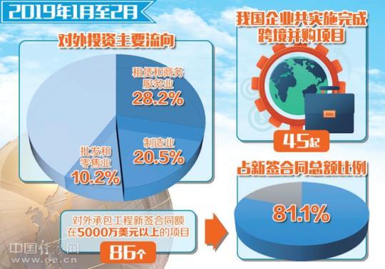 与此同时,跨境并购稳步发展。前两个月,我国企业共实施完成跨境并购项目45起,分布在英国、马来西亚等22个国家和地区,涉及制造业、金融业、租赁和商务服务业等12个行业大类,实际交易总额24.8亿美元,其中直接投资18.5亿美元。对外承包工程大项目多,带动当地发展作用明显。前两个月,对外承包工程新签合同额在5000万美元以上的项目86个,占新签合同总额的81.1%。对外承包工程完成营业额主要集中在交通运输建设和电力工程建设行业,合计占比超过60%,有效改善了东道国基础设施条件。(经济日报-中国经济网记者 冯其予)