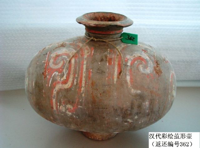 这是汉代彩绘茧形壶(返还编号362),图案为对称几何纹。