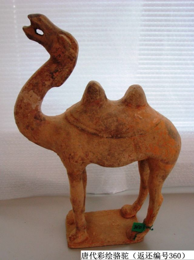 这是唐代彩绘骆驼(返还编号360),骆驼作昂首嘶鸣状。